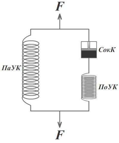 2. Учитывая, что жёсткость сухожилия мышцы на два порядка выше сократительного компонента, при пассивном растяжении мышцы должны растягиваться только СокК и ПаУК. В действительности ПоУК тоже растягивается.