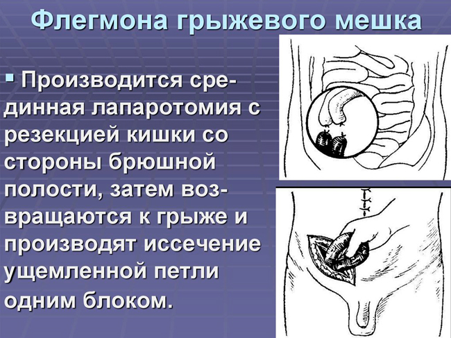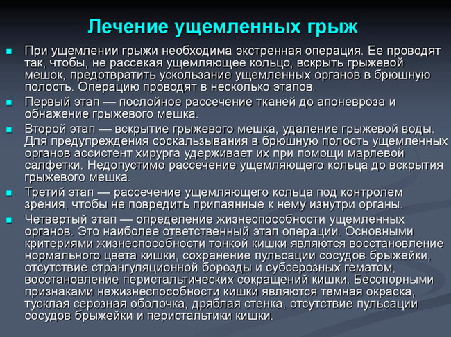 Неотложное вмешательство проводиться с целью рассечения ущемленного кольца, раздавливающего определенную область. В ходе вмешательства грыжа рассекается, высвобождается петля кишечника. При несвоевременном проведении манипуляция осложняется некрозом, наличием гнойного инфильтрата в области.