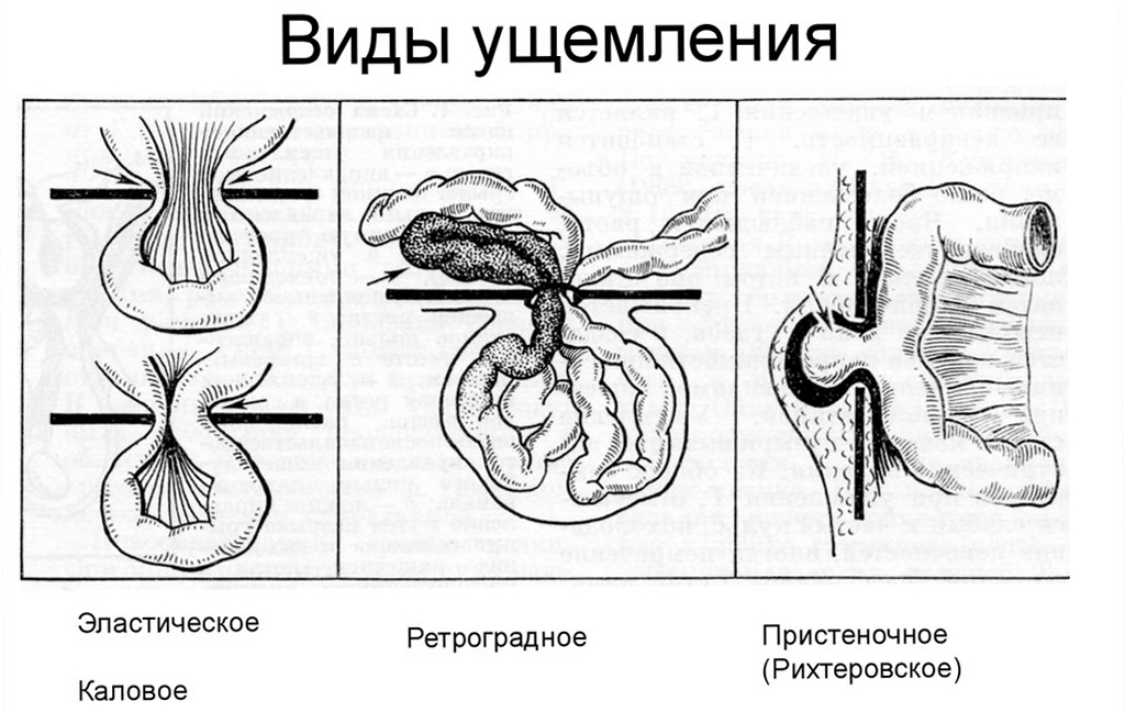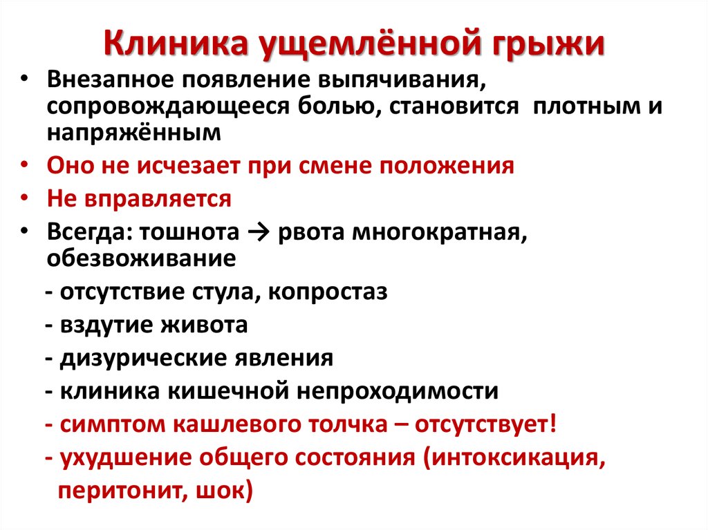Ущемляться могут грыжи любой величины. Ущемление малых грыж встречается реже и носит характер эластического. При больших грыжах ущемление, как правило, возникает по типу калового. Признаками ущемления, как и при грыжах другой локализации, являются внезапно возникшая боль в области грыжевого выпячивания и невправимость ранее вправляющейся грыжи. Следует иметь в виду, что больные могут не фиксировать внимание на болевых ощущениях в области грыжи, так как подобные боли, хотя и меньшей силы, часто наблюдались и раньше, поэтому необходимо выяснить характер и силу болей. При ущемлении кишечных петель развиваются симптомы острой кишечной непроходимости.