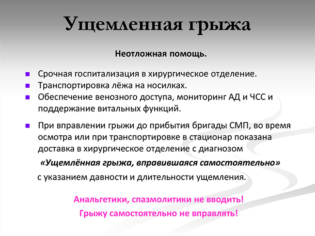 Больной с диагнозом ущемленная грыжа немедленно направляется в неотложное хирургическое отделение. Введение анальгетиков, спазмолитиков противопоказано.