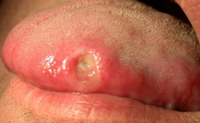 Шанкр на языке, это характерный симптом сифилиса, имеется четкие границы шанкра и углублении внутри язвы.