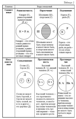Итак, в логике выделяется шесть вариантов отношений между понятиями. Для удобства их запоминания они представлены в табл. 2.