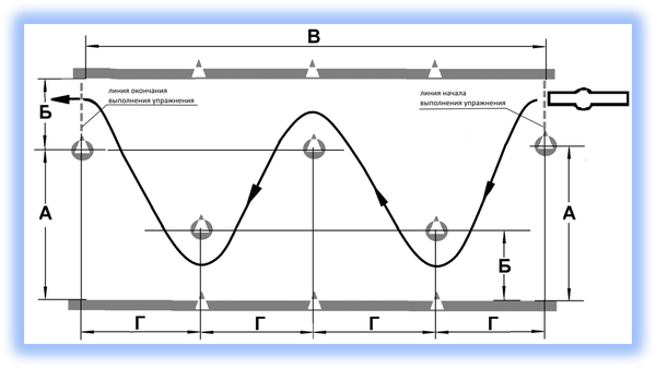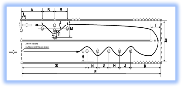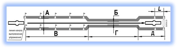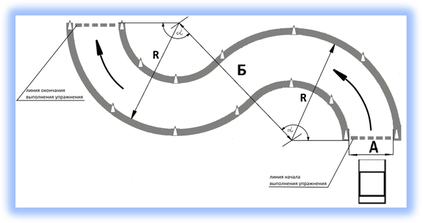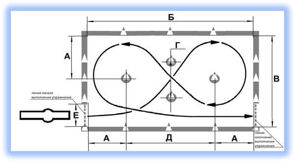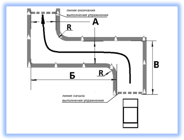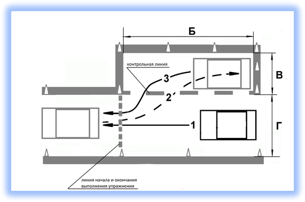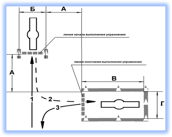 Кандидат в водители после пересечения на мототранспортном средстве линии начала выполнения упражнения останавливается в обозначенном месте так, чтобы мототранспортное средство по проекции заднего габарита пересекло линию начала выполнения упражнения, выключает двигатель и спешивается