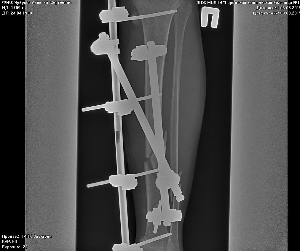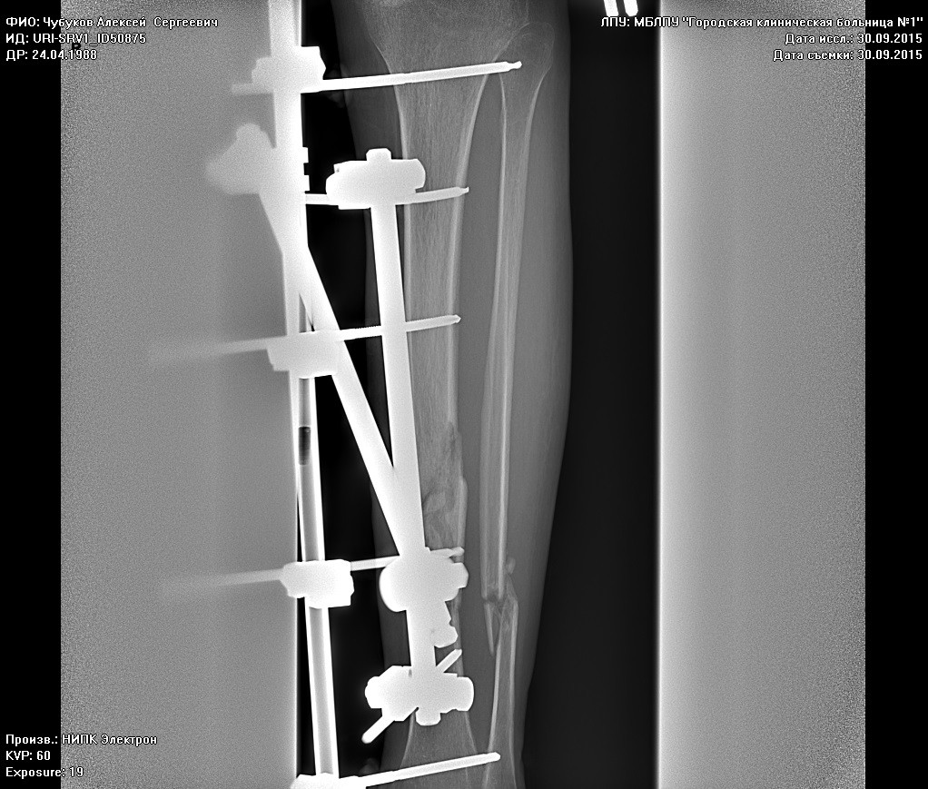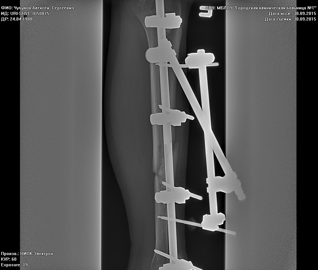 Вызывают скорую, минут 15 ожиданий, приезжает бригада, подозревают перелом, делают укол кеторола (подействовал только часа через 4), накладывают транспортировочную шину и увозят в больницу (ох уж что это за место, можно еще целую историю написать), со мной едет брат. Поднимают меня к дежурному врачу, тот достаточно болезненно пощупав синюшную к тому времени голень, говорит скорее всего перелом большеберцовой, надо рентген сделать, только вот проблема, кабинет в выходной не работает, а мобильный у второй бригады которая уехала в какой-то поселок. Матерюсь про себя, спрашиваю какой у меня прогноз если диагноз подтвердится. Врач взгрустнув заявляет, что с технологиями и квалификацией в тех краях туго, если останусь у них повесят на скелетное вытяжение, потом гипс, если плохо срастется будем снова ломать. Такой расклад меня в корне не устраивает, говорю что живу в Москве, спрашиваю врача, может мне туда стоит ехать? На что он говорит определенно стоит, там тебе могут остесинтез провести (тогда я еще не знал что это такое и врач не стал мне рассказывать). На том и решаем что я еду в Москву. Врач говорит "Ок, только давай рентген все таки сделаем, загипсуем тебя и отпустим на все четыре". Ждем бригаду с рентгеном, врач куда-то уходит, я остаюсь в приемном с братом. Время 18-30, с момента поступления прошел час, рентгена все нет, когда приедут неизвестно. Я уже весь в ярости ко всему что со мной произошло и от того сколько мы ждем этот рентген. Отправляю брата искать врача, чтоб накладывали мне гипс и мы поехали, нечего время терять.Спустя 10 минут поисков, возвращается брат со врачом, меня увозят в перевязочную, две медсестры накладывают мне гипс от пятки до бедра. Пишу отказ от медпомощи, напоследок врач говорит как приедете в Москву сразу вызывайте там скорую. С помощью брата и прыгая на одной ноге направляемся к прибывшей за нами машиной. Возвращаемся домой, там жена подготовилась и собрала наши вещи прыгаем в машину брата, мчимся в столицу.