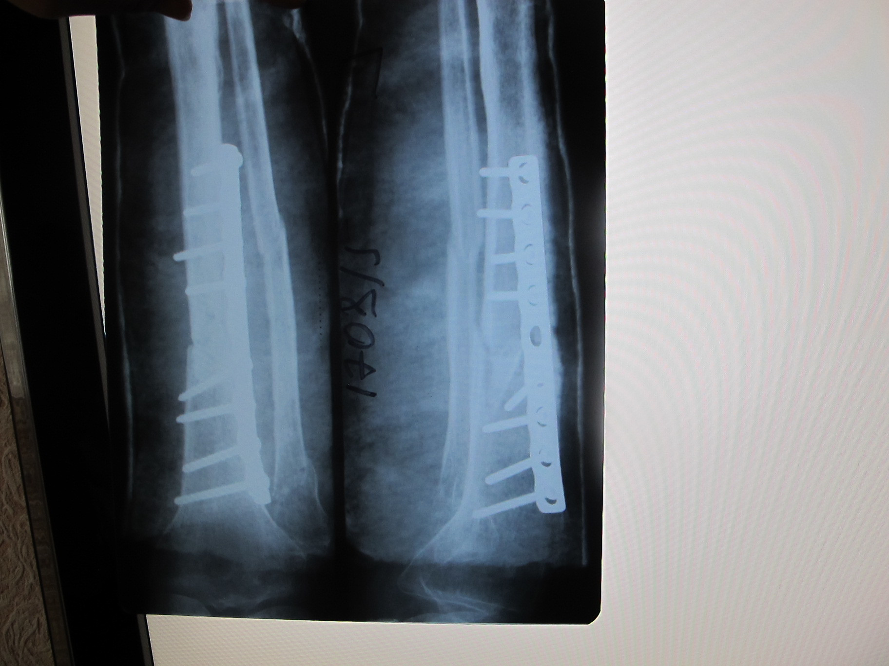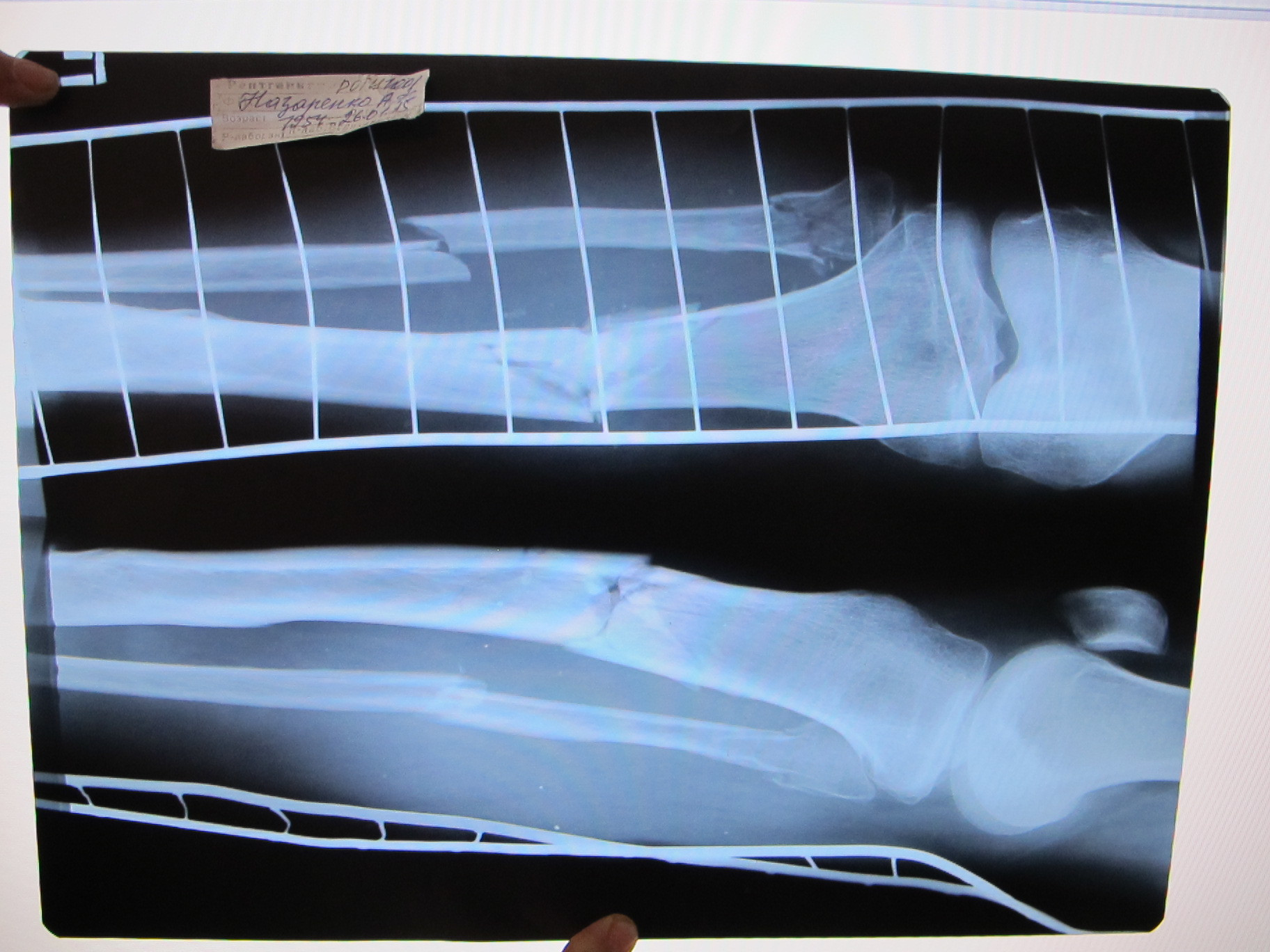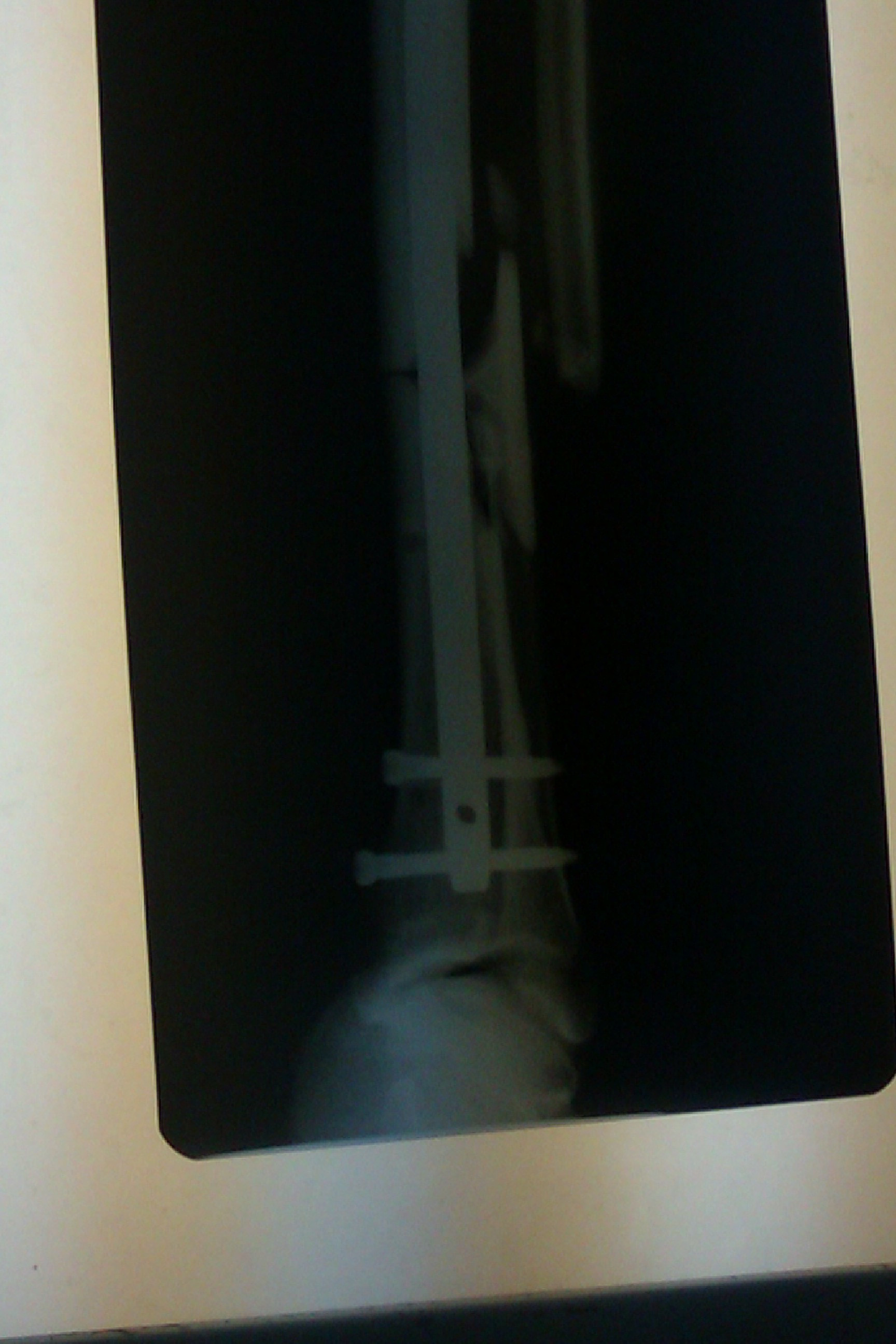 Понедельник. Время обхода. Зашел врач с зав. отделением спросил лишь такой-то такойтович, получив утвердительный ответ, оба быстро испарились настолько, что я не успел ничего ни сказать ни спросить. Только в обед вернулся лечащий врач и сообщил "У Вас закрытый винтовой перелом нижней трети большеберцовой кости со смещением". Из хороших новостей было лишь то, что мне не потребуется скелетное вытяжение, т.к. после травмы вовремя зафиксировали ногу и не произошло сильного смещения. Далее было предложено на выбор три варианта лечения - 1) Гипс до пояса минимум на три месяца и постельным режимом, 2) Остеосинтез пластиной, бесплатно, месяца два в постельном режиме и шрам 15-20см после операции. 3) Остеосинтез штифтом, и через неделю будете снова ходить на своих двоих (опять я наивный поверил, забыл врач добавить что на своих двоих с костылями), но у нас их нет, поэтому если хотите штифт, придется его купить, а поставим по ОМС (об этом будет отдельная история как я деньги за него возвращал).