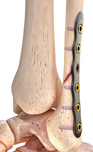 Оперативное вмешательство при переломах пилона обычно очень сложное, выполняют его самые опытные врачи. Основная задача хирурга-травматолога – сохранить функцию голеностопного сустава. При этой операции стараются не делать обширных разрезов мягких тканей, чтобы избежать трудностей с заживлением операционной раны и исключить присоединение инфекции. Лучшие результаты в настоящее время можно получить, используя малоинвазивную технику операции. При ней костные отломки большеберцовой кости вначале закрыто растягиваются специальным аппаратом, а потом через мини-разрезы фиксируются подкожно проведенными пластинами и винтами. После малоинвазивной операции при переломе пилона отек обычно меньше, рана заживает быстрее, а что самое главное – снижается риск инфекционных осложнений.