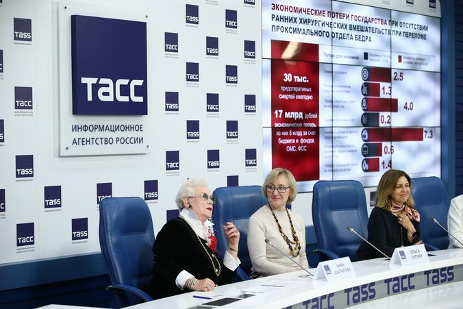 Слева направо: советский и российский Диктор Центрального телевидения Гостелерадио СССР, теле- и радиоведущая, актриса, Заслуженная артистка РСФСР, Народная артистка РСФСР Анна Шатилова, президент Российской ассоциации по остеопорозу, доктор медицинских наук, профессор Ольга Михайловна Лесняк и главный гериатр Министерства здравоохранения РФ, доктор медицинских наук, профессор Ольга Николаевна Ткачева.
