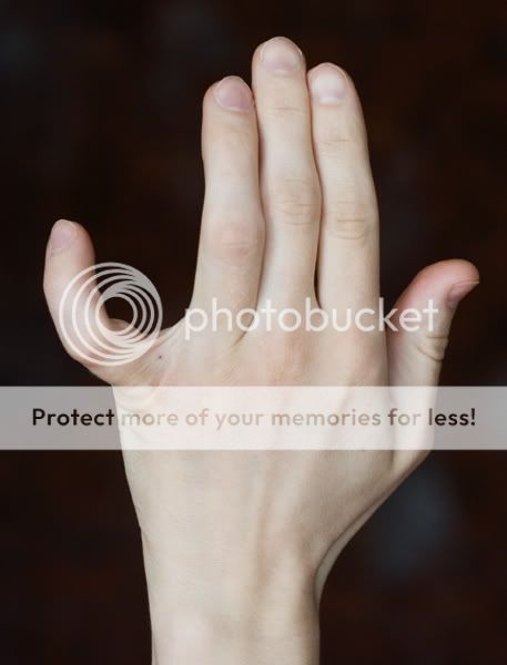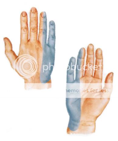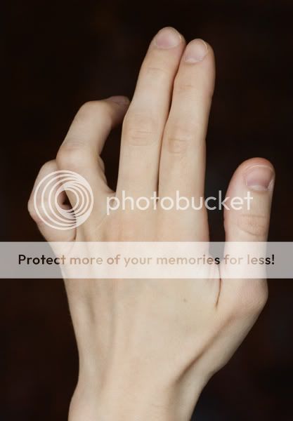 Вначале может отмечаться потеря ловкости, неуклюжесть. Возникают трудности при письме, открывании бутылки и т.д. и т.п. Изначально симптомы непостоянны, то есть возникают, когда локоть находится в согнутом положении (разговор по телефону, к примеру). Постепенно симптомы прогрессируют до очень сильной слабости. Развивается когтеобразная деформация IV-V пальцев. Выглядит приблизительно так (почему приблизительно? Потому что это моя рука, а у меня нет "когтистости", я просто попыталась ее изобразить):
