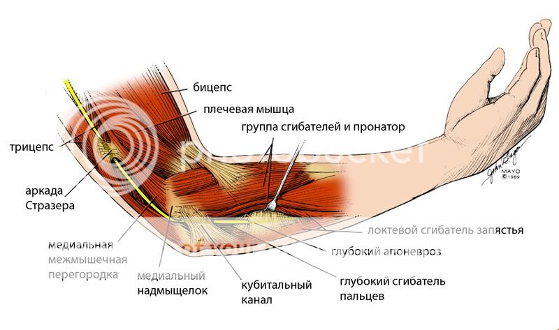 На своем пути нерв встречает ряд препятствий, которые могут приводить к его сдавлению. В области локтя существует целых 5 таких мест (про них читать необязательно, поэтому я уменьшу шрифт, но на картинке их видно).