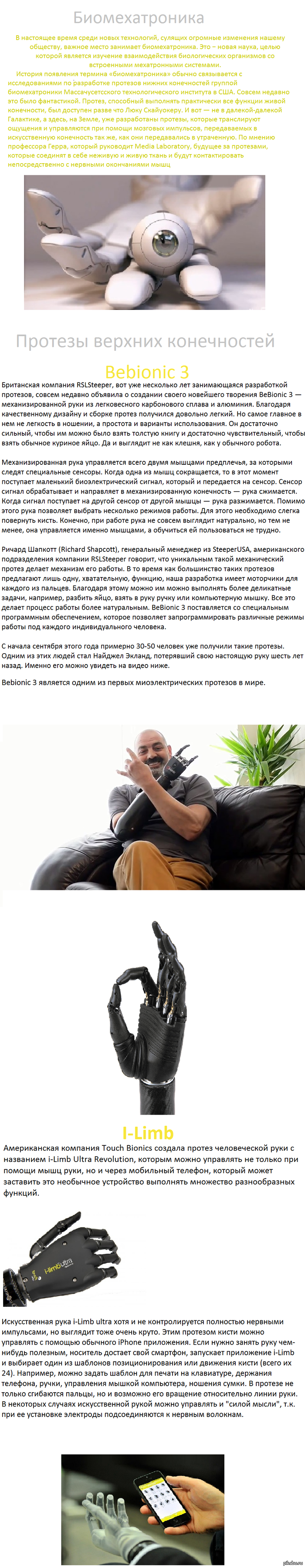Своими успехами разработчики бионических протезов обязаны последним достижениям науки и техники в области аккумуляторов высокой плотности, появлению различных сенсорных устройств, позволяющих бионической руке чувствовать и ощущать взаимодействие с объектами подобно человеку, компактных электрических моторов, высокая эффективность которых обусловлена прогрессом в области производства магнитов на основе редкоземельных металлов. А также микропроцессорам, способным с высокой скоростью обрабатывать информацию от множества сенсоров и принимать решение по управлению приводами пальцев для достижения заданного положения.