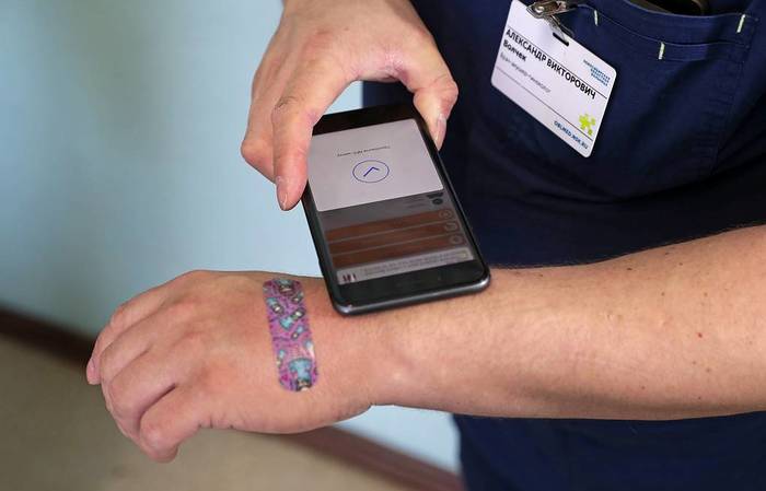 Пока обрабатывается информация, он активно предлагает вживить недавно разработанный чип, который подсвечивает татуировки.