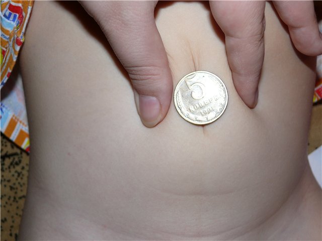 Необходимо сделать ужимающую привязку. Для этого нужно взять пятикопеечную монету (желательно старого образца), обернуть ее мягкой тряпочкой и как можно более плотно прикладывать к пупочной грыже. После этого ее следует зафиксировать при помощи лейкопластыря или же бинта. Такую процедуру следует проделывать на протяжении трех суток.