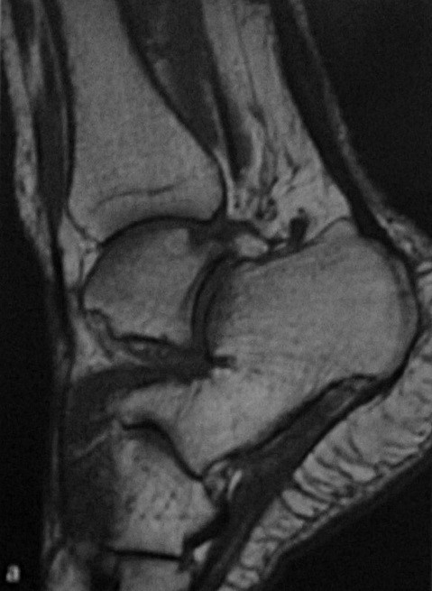 a,b МРТ при разрыве ахиллова сухожилия: (a) Полный разрыв проксимального конца ахиллова сухожилия после мышечно-сухожильного соединения