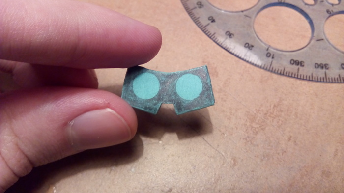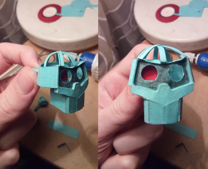 - Но как же управлять веками? Пришлось их сперва соединить кольцом из двойной бумаги и его край скрутить в трубку, конечно предварительно были сделаны две тонкие трубки (для двух глаз) в которые и вставлялся скрученный край.