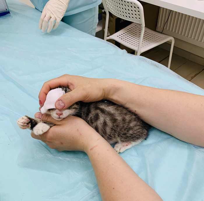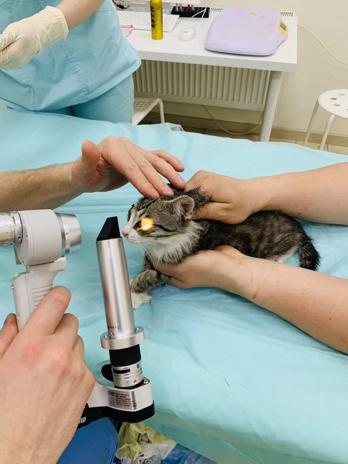 На прошлой неделе мы были в Прайде у окулиста: Тиму нужно удалять глаз и пытаться проапериповать тот глаз что целый, в нем произошло сращение конъюнктивы и третьего века. Если их отделить, то может быть (50/50 шанс), что котёнок будет видеть. На данный момент Тим полностью слепой и даже не видит свет, но нужно попытаться спасти глаз. У Флинна (на тот момент, когда я их нашла) уже вытек и зажил один глаз, со второго снимаем воспаление и он им хорошо видит. Операции проводить пока нельзя, котят нужно стабилизировать и вылечить от вируса.