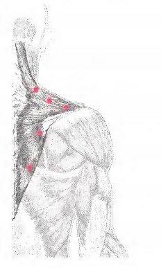 Точки напряжения в средней группе мышечных волокон проявляются нечасто, но когда они возникают, то вызывают боль между лопатками около позвоночника.