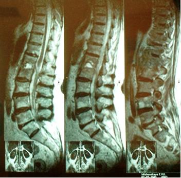 - МРТ (магнитно-резонансная томография) – метод выбора, обязателен при диагностике спондилодисцита, остеомиелита позвоночника и дисцита, демонстрирует вовлечение дискового пространства и тела позвонка, позволяет исключит паравертебральный или эпидуральный спинальный абсцессы, малоинформативна для определения сращения костей;