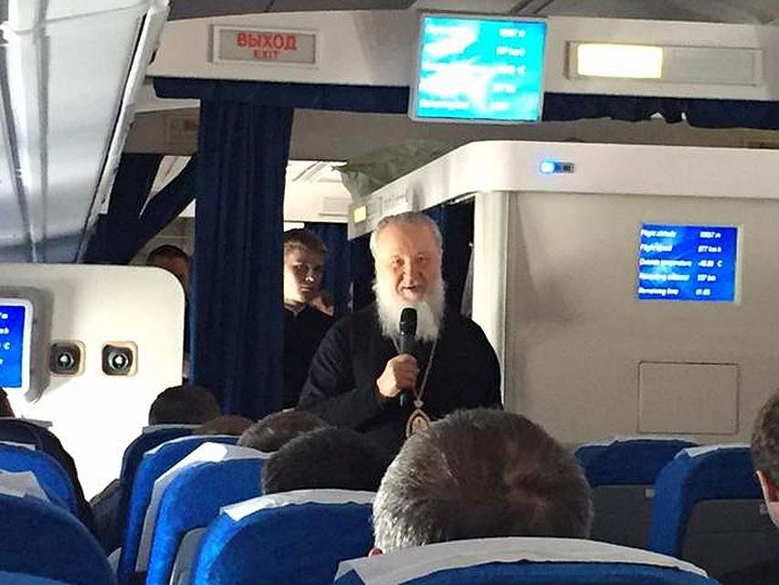Главный пассажир (на фото справа) велит облететь всю Чукотку. Фото: пресс-служба Патриарха