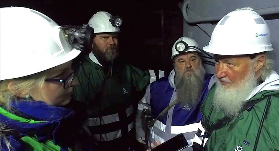 Моя любимая фотография со Святейшим - в касках с фонариками из шахты Кировского рудника АО "Апатит". На глубине 350 метров он изучал работу горняков. Очень дотошно. Как и всегда.