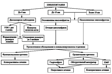 Для оценки степени расширения почечных лоханок при двусторонней пиелоэктазии за их состоянием необходимо наблюдать: делать УЗИ каждые 3 месяца. В случае прогрессирования патологического процесса, характеризующегося функциональным нарушением почек, прибегают к оперативному вмешательству, которое проводится с целью нормализации мочевого оттока.