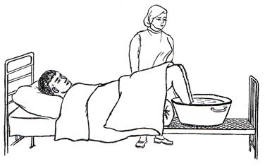 Ноги больному моют 1-2 раза в неделю, поставив тазик в постель (если больной не может сидеть). Ногти моют щёткой, подногтевые пространства очищают специальной ногтечисткой. По мере необходимости ногти подрезают (не очень коротко). Гигиенические ванны больные в удовлетворительном состоянии принимают полусидя, погружаясь в воду до верхней части груди. Температура воды должна быть 36-38 0 С, продолжительность – не более 30 минут. Лежачим больным можно делать местные ванны для рук, ног.