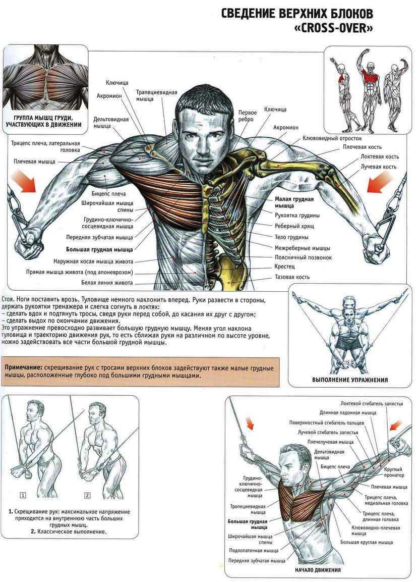 Считается, что это упражнение — самый хороший тренинг, который подходит для программы тренировок для начинающих, так как сравнительно легкое в плане техники и отлично вписывается в комплекс для пока еще не развитых мышц. Аналогичное упражнение можно выполнять в тренажере Кроссовер.