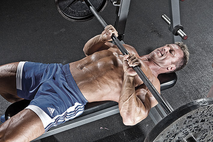 Жим штанги лежа на горизонтальной скамье включает в работу малую и большую грудные мышцы, а также переднюю дельтовидную, переднюю зубчатую и трицепс.