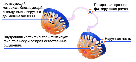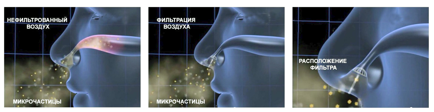Носовые фильтры неглубоко вставляются в ноздри, блокируя попадание в дыхательные пути аллергенов, болезнетворных вирусов и бактерий , пыли и пыльцы, взвешенных частиц, выхлопных газов, табачного дыма и других загрязнителей воздуха. Надежную фиксацию обеспечивает тончайшая прочная и гибкая прозрачная рамка, располагаемая под носом. Простота дыхания и комфорт гарантированы даже при быстрой ходьбе и беге. Все части устройства выполнены из нетоксичных материалов, фильтр имеет компактный размер и совершенно не заметен для окружающих.
